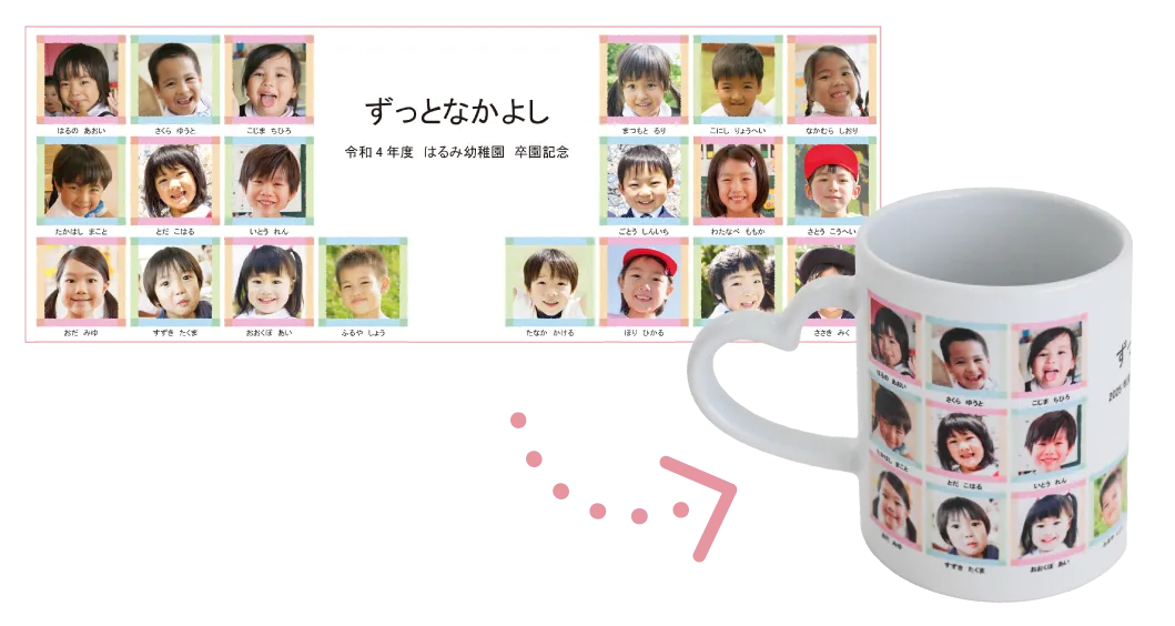 集合写真を大きく1枚入れることもできます。自由にテキストを入れることもできて、まさに記念品にぴったりの一品。